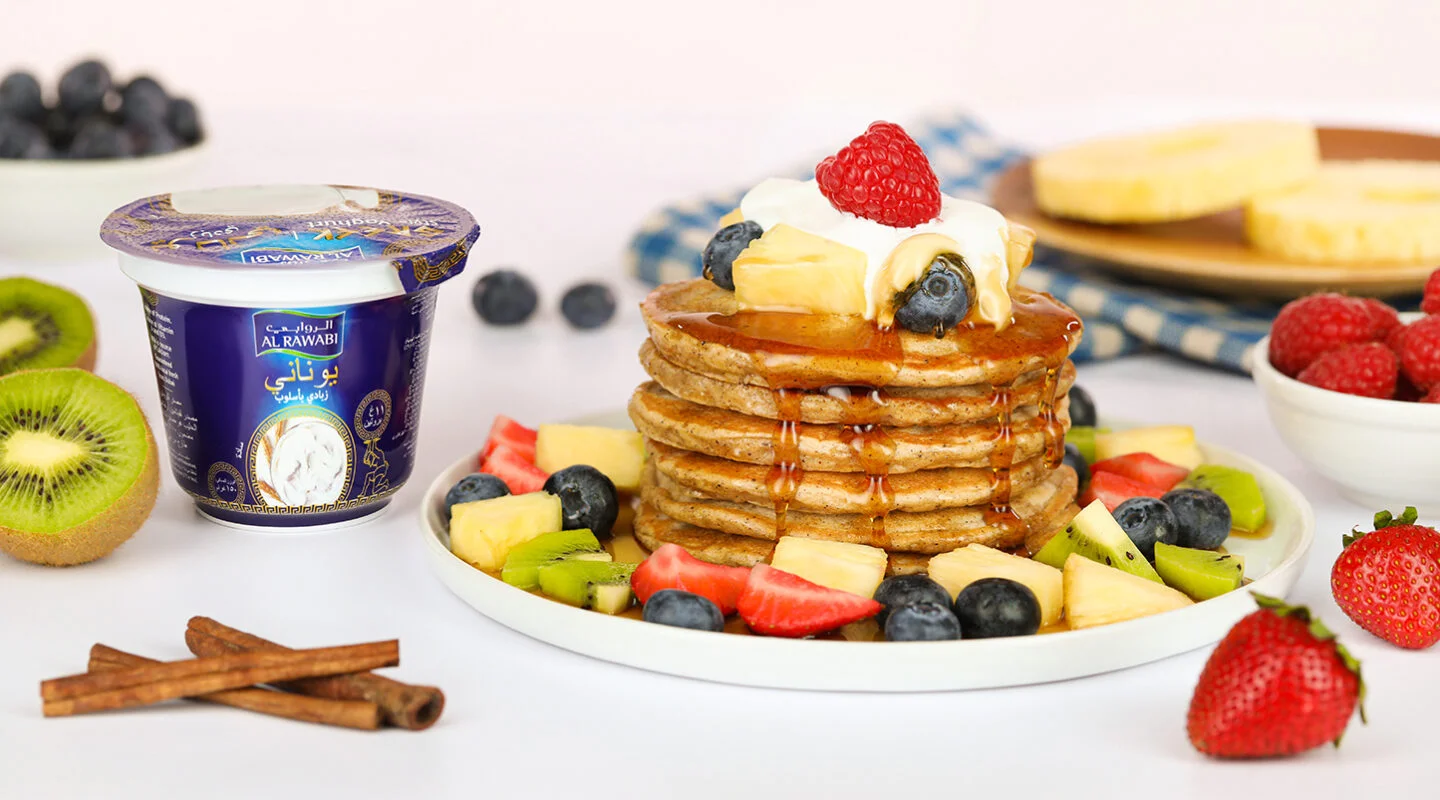 - When all pancakes are done, top pancakes with Greek Yogurt topping are made with ½ cup Al Rawabi Greek Yoghurt Plain, and 1 tbsp maple syrup. Also add fruits that you like and enjoy!