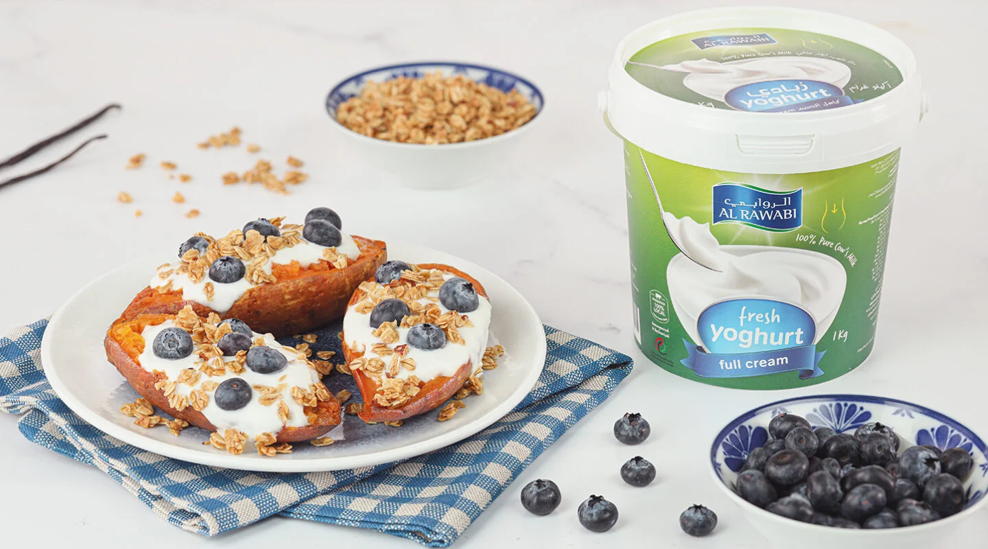 Enjoy the simple, easy-to-bake sweet potatoes that require only just a few easy steps! Serve with Al Rawabi Full Cream Fresh Yoghurt, Blueberries, and Granola.