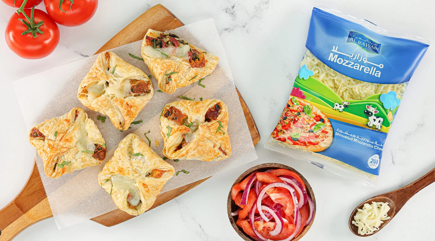Preheat the oven to 180 degrees Celsius. Combine the cooled greens, Al Rawabi Mozzarella Cheese, and Strips Beef in a mixing bowl. Season to taste and pile into the center of each pastry square. Squeeze the pastry edges together gently. Brush with the beaten egg and set aside for 10 minutes to chill.
