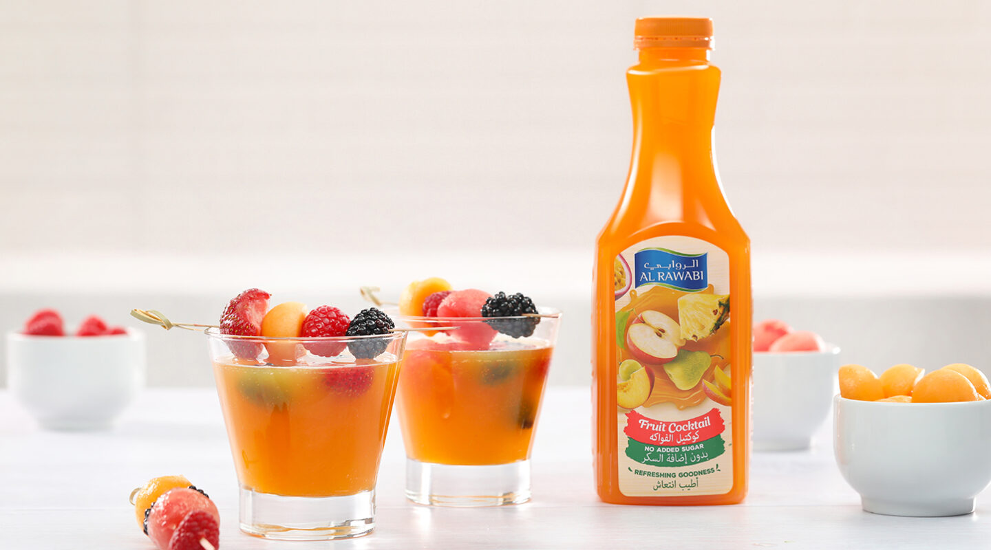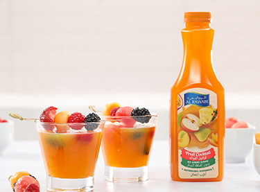 1.يُمزج عصير كوكتيل الفواكه والماء الفوار، ونصف الفاكهة المشكلة. يوضع في الثلاجة، وتترك تبرد حتى تصبح جاهزة للتقديم.